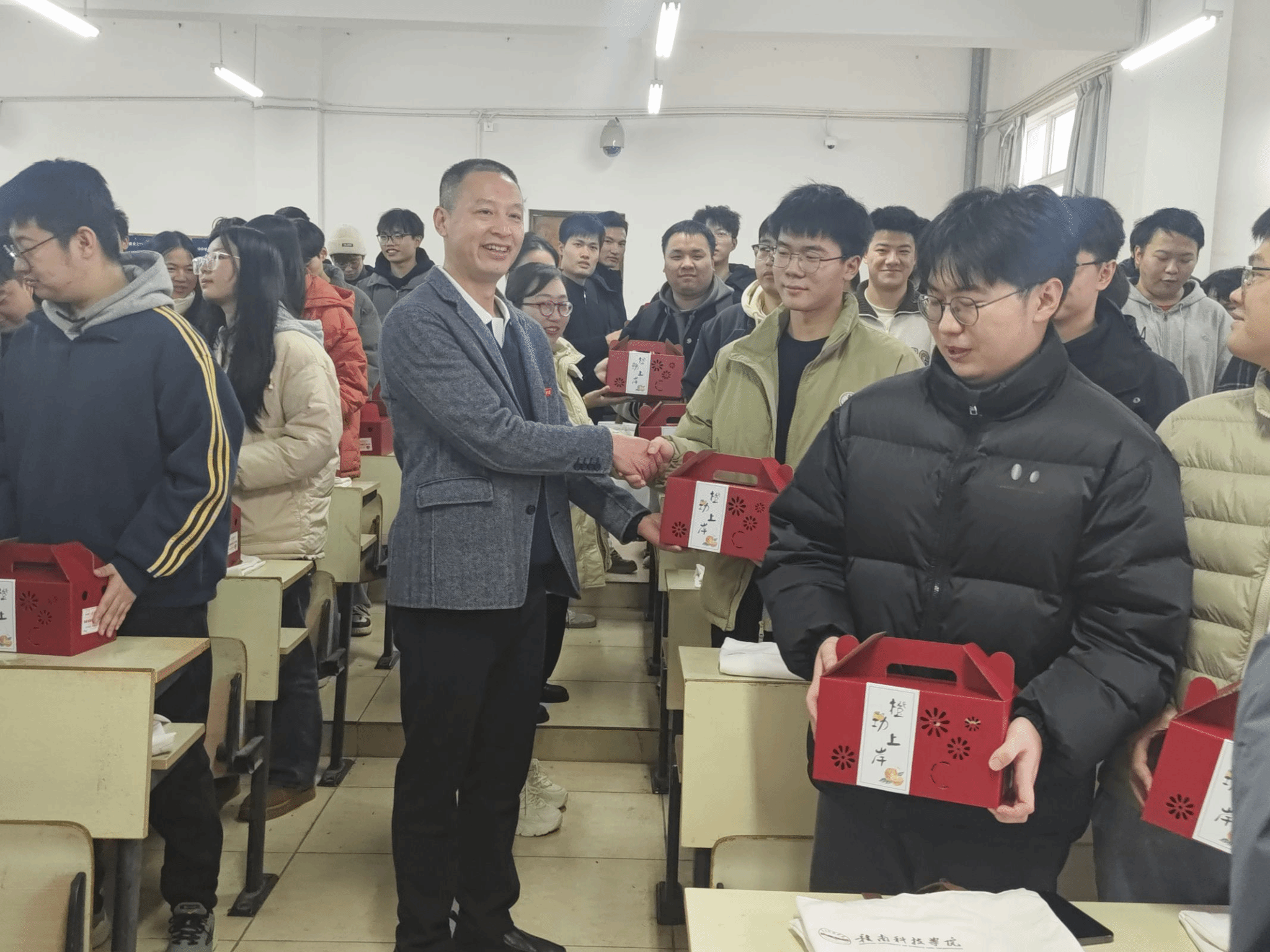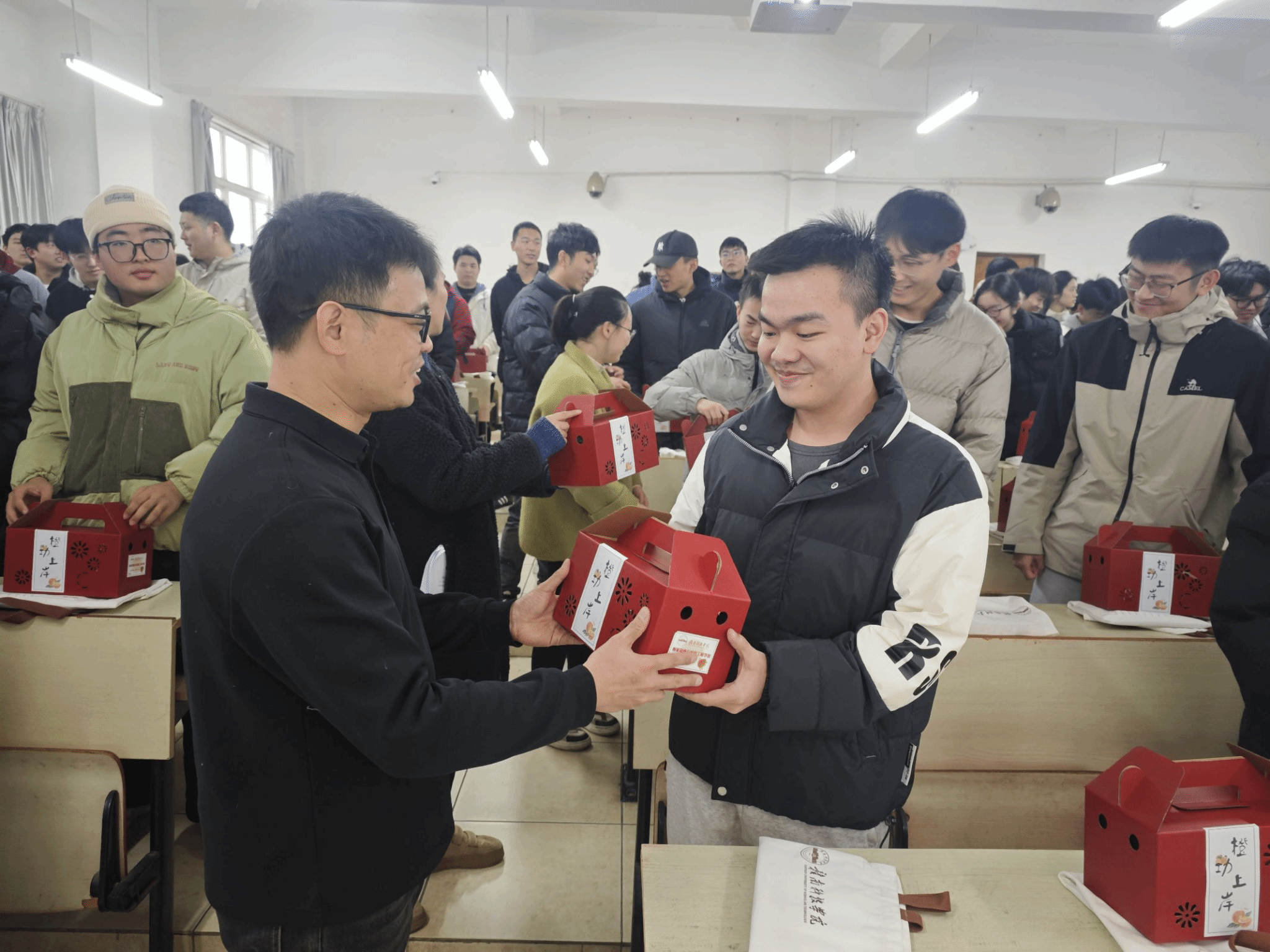 为了表达对考研同学们的关心和支持,学院全体老师特意准备了寓意着“心想事成,大吉大利”的脐橙和满载祝福的考研大礼包。一份份礼物传递着学院对同学们的深情厚谊和美好祝愿,让在场的每一位同学都感受到了来自学院的温暖和力量。