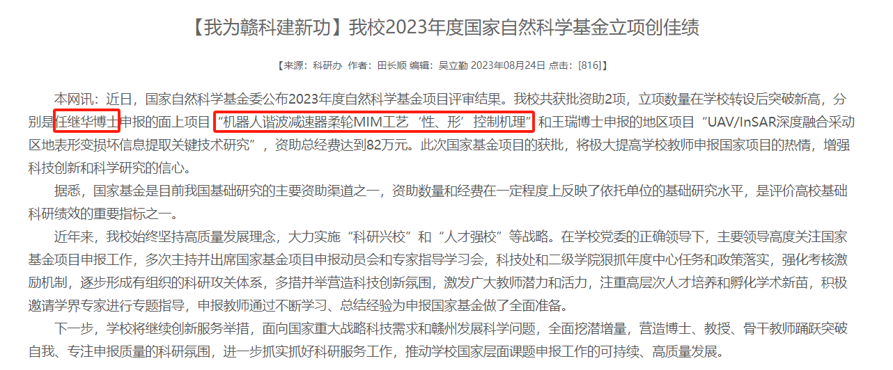 为进一步提高教育教学质量与科研创新能力,11月3日,“精密传动系统科研创新团队”建设启动会在工程研究院S416A会议室召开。国家自然科学基金委公布2023年度自然科学基金项目评审结果。beat365官网共获批资助2项,立项数量在学校转设后突破新高,分别是任继华博士申报的面上项目“机器人谐波减速器柔轮MIM工艺‘性、形’控制机理”和王瑞博士申报的地区项目“UAV/InSAR深度融合采动区地表形变损坏信息提取关键技术研究”,资助总经费达到82万元。此次国家基金项目的获批,将极大提高学校教师申报国家项目的热情,增强科技创新和科学研究的信心。