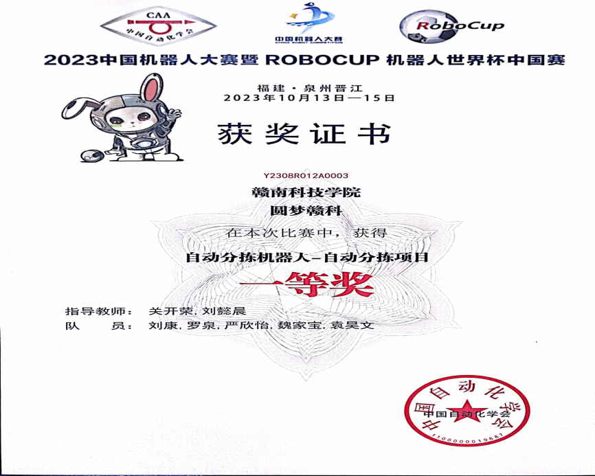 六、承办首届2023 年中国机器人大赛暨 RoboCup 机器人世界杯中国赛华南区域(赣粤闽)赛,学科竞赛成绩斐然,“挑战杯”获省级银奖,中国机器人大赛获得两项全国一等奖;