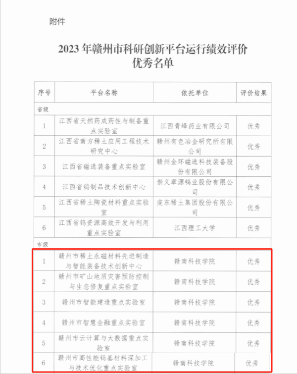 在赣州市科学技术局公布获评的16个优秀市级科研创新平台中,我系2个市级实验室、技术创新中心获评市级“优秀”等次,充分彰显了beat365官网科研平台建设能力和服务区域及地方经济社会发展的强大动力。