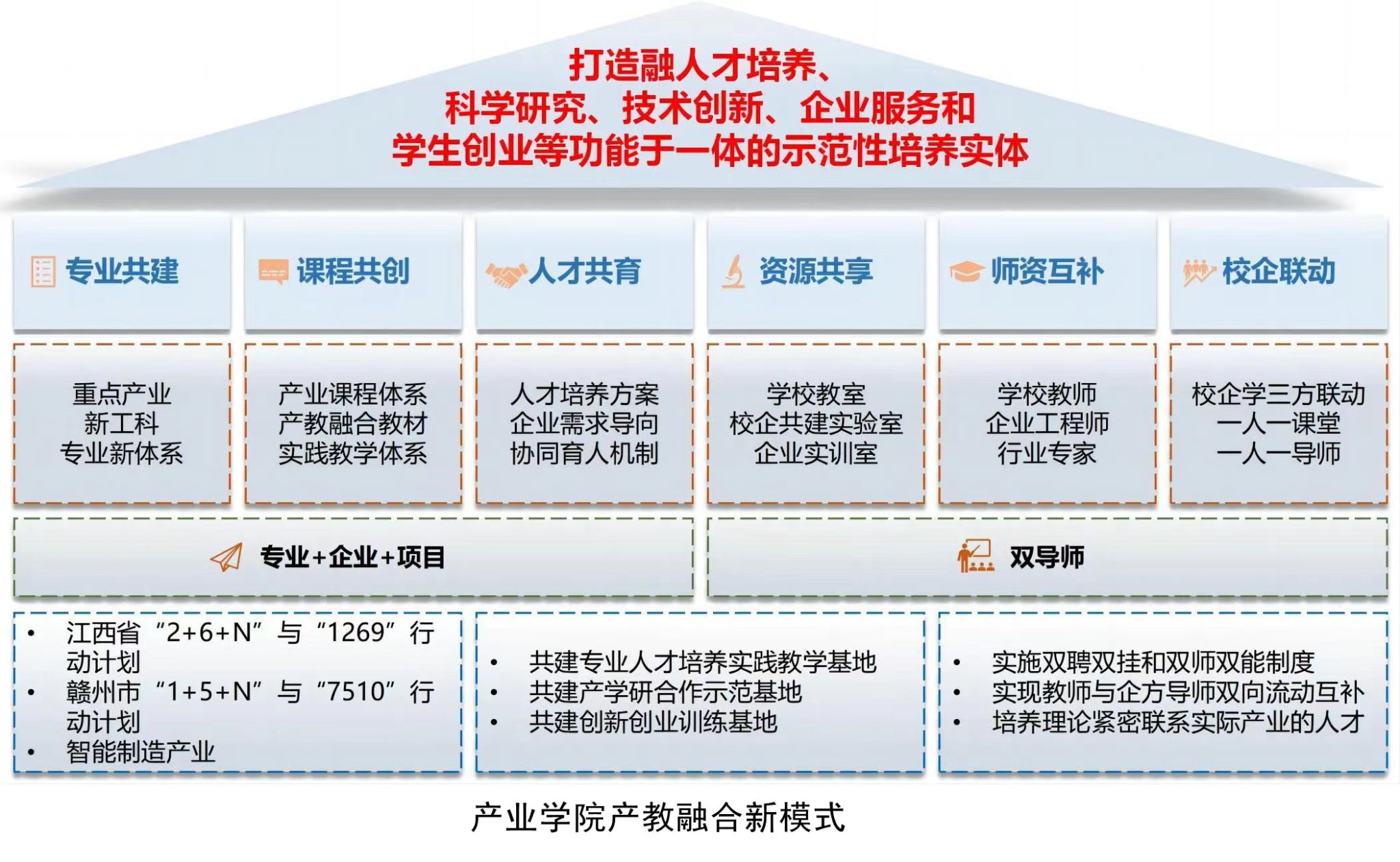 产业学院立足赣南、服务江西、面向赣粤智能制造产业,围绕装备制造、新能源、现代家具、电子信息等产业智能制造示范基地建设,积极贯彻落实《国务院办公厅关于深化产教融合的若干意见》(国办发〔2017〕95号)、教育部和工信部印发《现代产业学院建设指南(试行)》(教高厅函〔2020〕16号)、《江西省普通本科高校现代产业学院建设实施方案》(赣教高字〔2021〕23号)等文件精神,和学校以现代产业学院建设推进新工科建设、实现产教深度融合、培养高素质应用型人才的应用型本科高校建设思路,以服务新时代革命老区高质量发展示范区建设为己任,聚焦江西省“1269”与赣州市“7510”行动计划重点产业链,深化产教融合,培养高素质应用型、复合型、创新型人才,“政校企会”协同,构建“教育+培训+服务+就业+创业”的完整人才培养服务链与多方协同育人良好生态,打造融人才培养、科学研究、技术创新、企业服务和学生创业等功能于一体的示范性培养实体。