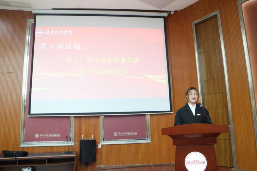 随后,“爱云”奖学金捐赠者——2012届优秀校友夏燕云线上致辞,她向获得奖学金的同学表示祝贺,希望这些同学能够心怀感恩,勤勉上进,刻苦学习,取得优异的成绩,未来有一定的经济能力之后,也愿意将这份爱心延续下去,为母校做出贡献。紧接着,由第一届“爱云”奖学金获得者代表工业191班刘青丽同学上台发言,她对夏燕云学姐表达了最衷心的感谢,并表示在今后的日子里,要不断坚定理想信念,继续砥砺奋进,以更严格的标准要求自己,向更高的目标迈进。