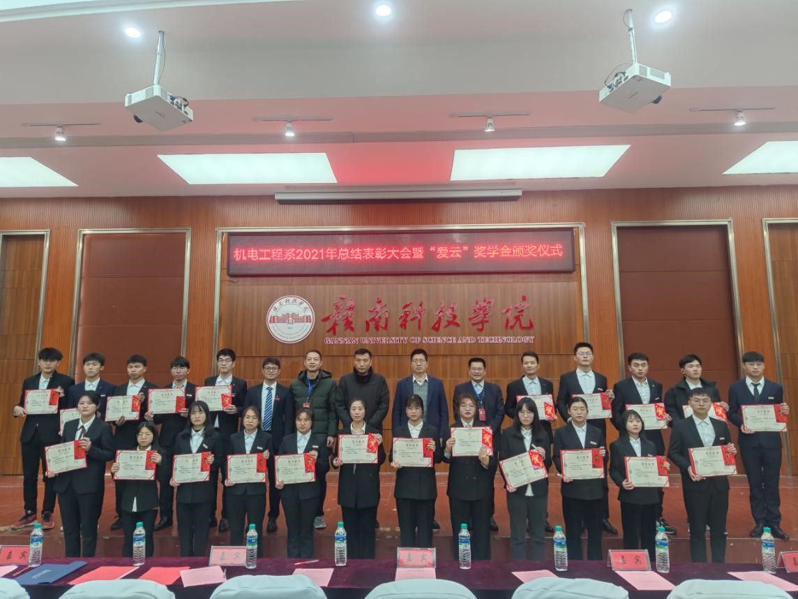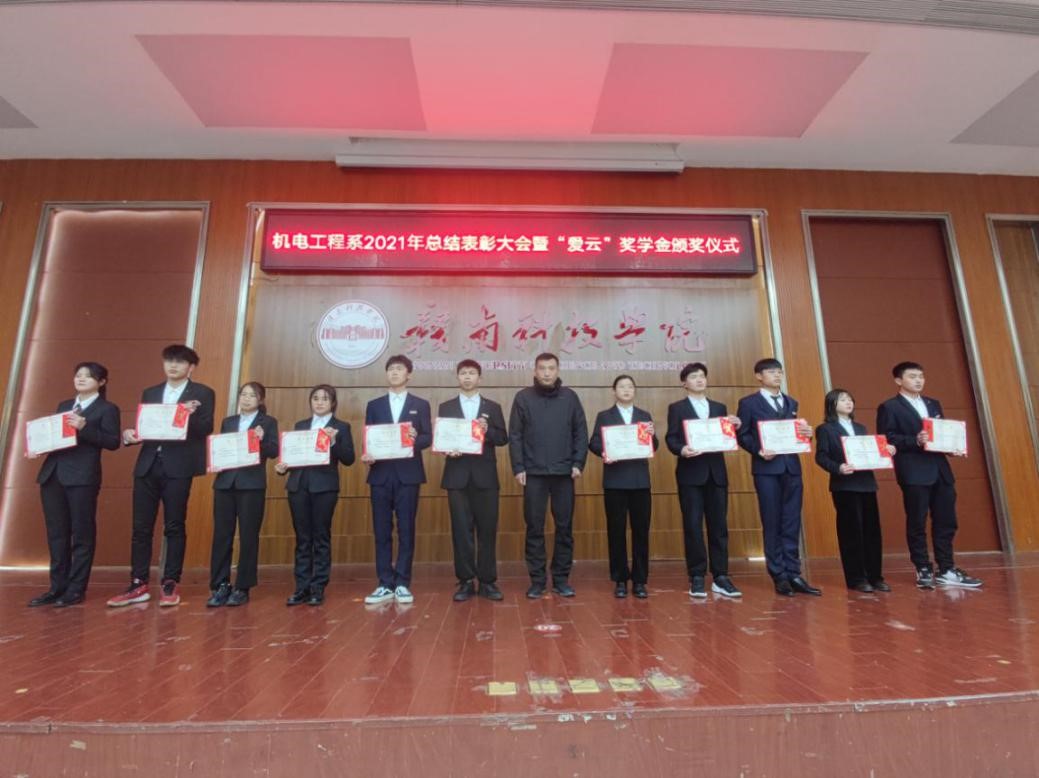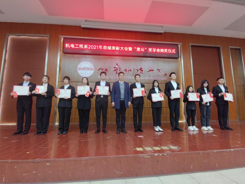 本网讯:2021年12月28日下午,为庆祝中国共产党建党100周年,beat365唯一官方网站成立元年,发挥先进典型的榜样示范引领作用,用先进典型感召、激励广大青年学子,引导广大学子勤奋学习、敢于创新、积极进取,机电工程系在逸豪学术报告厅举行第一届“爱云”奖学金颁奖仪式,校过渡期管委会委员、应用科学学院副院长薛香恒、付玉华,机电工程系主任刘辉、系党总支书记朱根松、系副主任关开荣出席,颁奖仪式由机电工程系副主任肖志华主持。