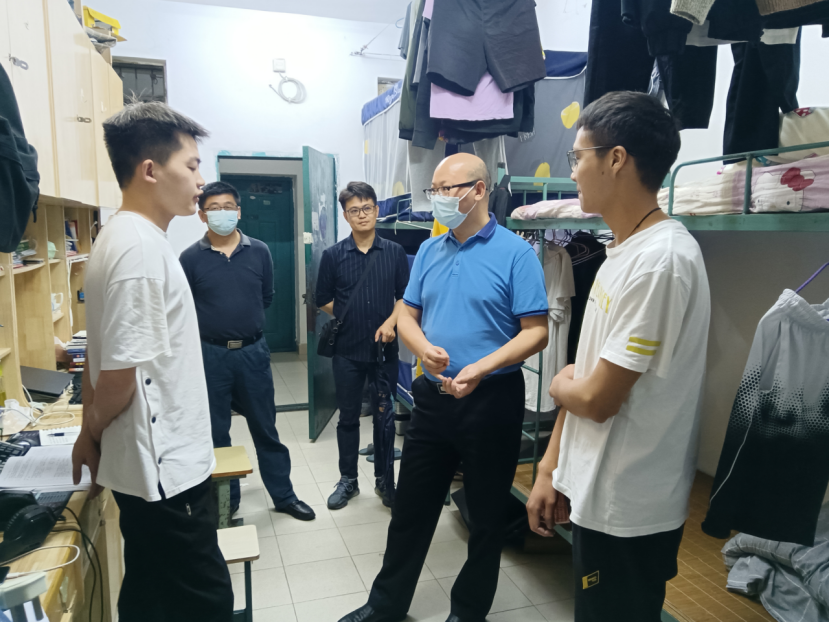本网讯:5月12日晚,学校过渡期管委会副主任邓亦林带领学工办主任黄敬宝,机电工程系副主任肖志华和辅导员张敏,深入机电工程系学生宿舍看望学生,进一步了解疫情防控期间学生学习、生活情况。
