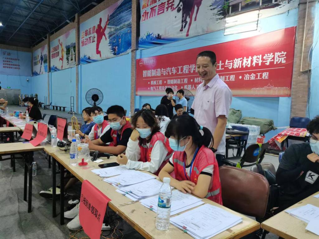 机电工程系主任刘辉老师在新生报到处关心慰问志愿者们。
