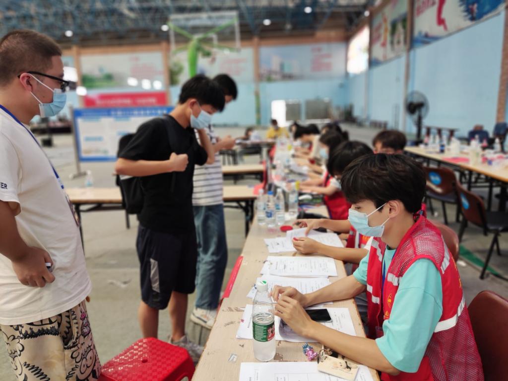 beat365唯一官方网站过渡期管委会常务副主任何锦龙在新生报到处慰问夜班志愿者们。