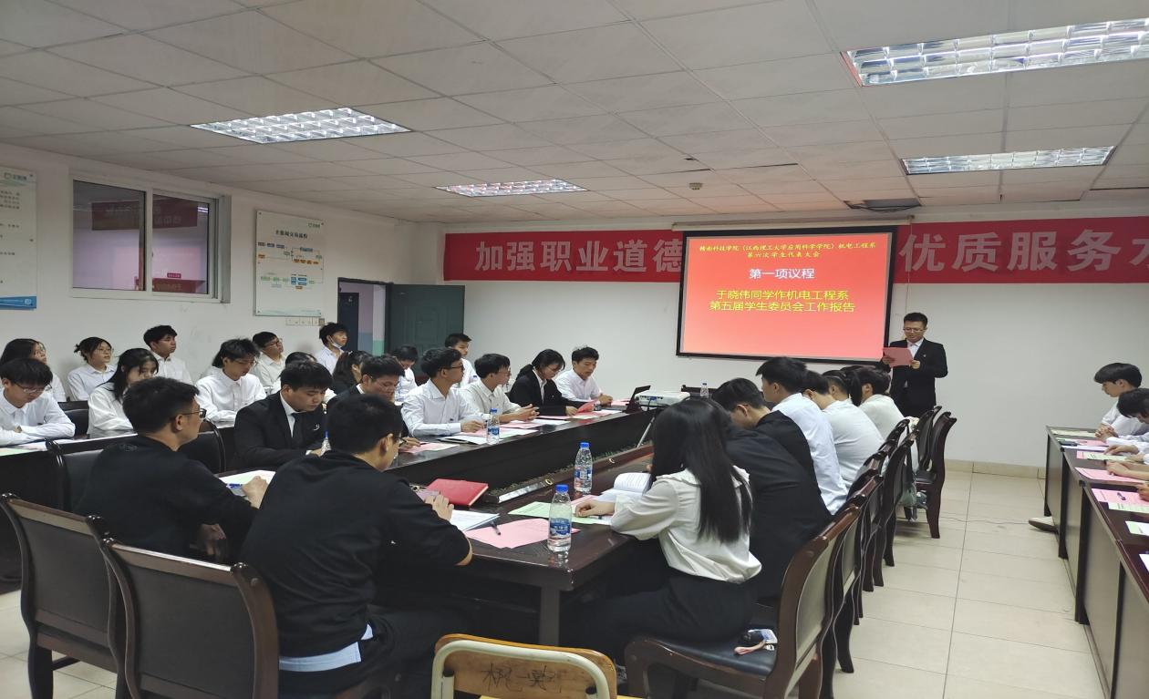 此次学代会共包含三场会议,分别为预备会、开幕式和正式会议。会议议程包括奏唱国歌、刘辉致总结词、肖志华致开幕词、学生会执行主席于晓伟同学作《beat365唯一官方网站机电工程系第五届学生委员会工作报告》、选举机电工程系第六次学生代表大会常任代表、选举参加第五次校学代会代表及常任代表、讨论通过《机电工程系学生会章程》等各项议程。