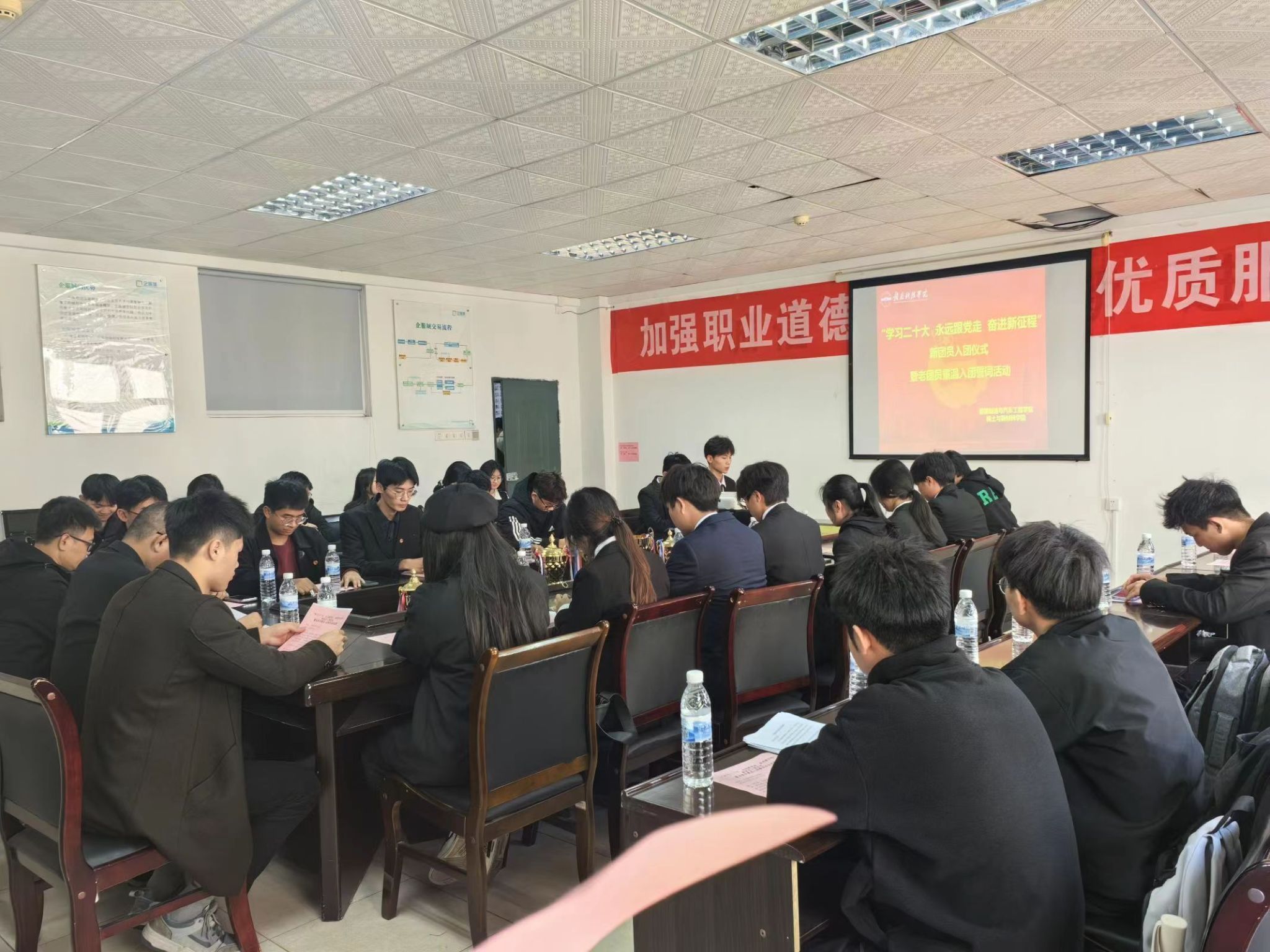 本网讯:为深入学习党的二十大精神,传承和弘扬五四精神,团结引领青年学生自觉培育和践行社会主义核心价值观,坚定不移跟党走,建功新时代。2023年12月7日下午,机电工程系在工程院s416A举行2023年机电工程系新团员入团仪式暨老团员重温入党誓词活动,机电工程系党总支书记朱根松、机电工程系副主任肖志华、机电工程系团总支书记卢名亮及各班团支书出席仪式。