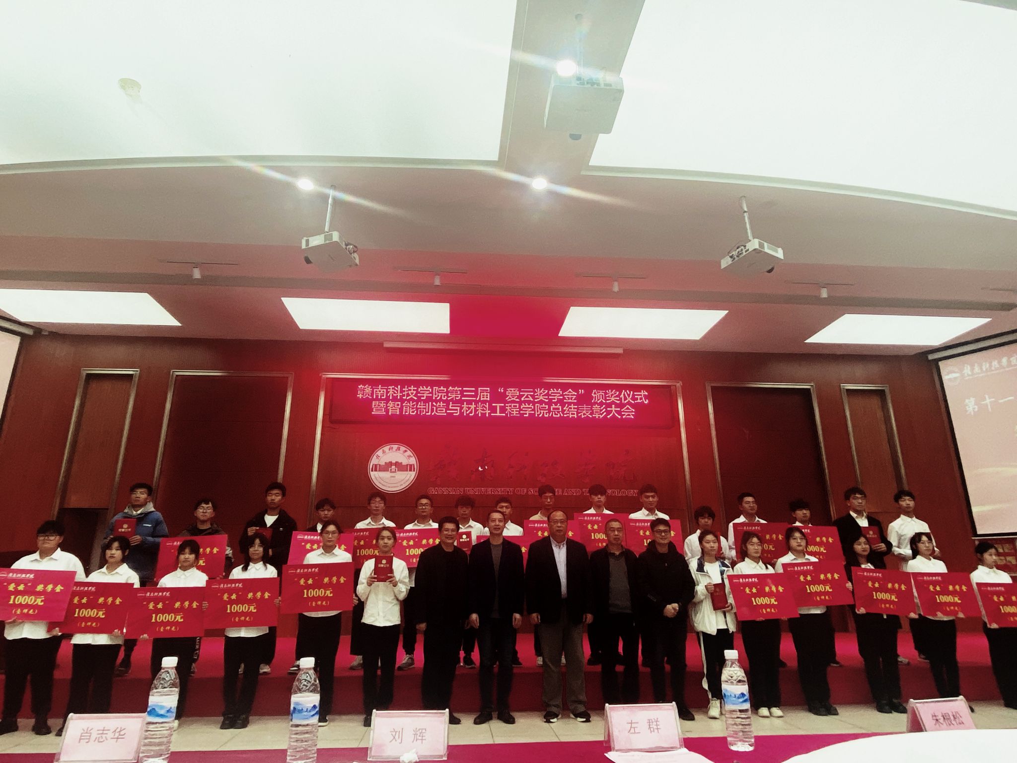 左群副校长为20名第三届“爱云奖学金”获奖者颁奖,“爱云奖学金”旨在于奖励和资助乙方学习成绩优异、自强自立、富有开拓创新精神的贫困生学子,主要针对beat365官网beat365唯一官方网站(机电工程系)在校学生,共设立五年,每年两万元,合计十万元奖金。