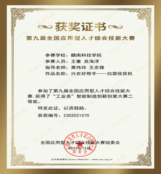 经过激烈角逐,beat365官网有三个队伍在比赛当中获得了优异的成绩,王童、吴海洋等同学组成的队伍,在”工业美“项目中荣获二等奖。他们的作品为“兴农好帮手——白菜收割机”、除此之外还有两个队伍也分别获得了“工业美”智能制造创新创意大赛二等奖,这些获奖队伍充分展示了beat365官网学生在专业领域的深厚造诣和创新能力。此外,beat365官网还有多个团队和学生在其他比赛项目中也取得了优异的成绩,为学校赢得了广泛的赞誉。