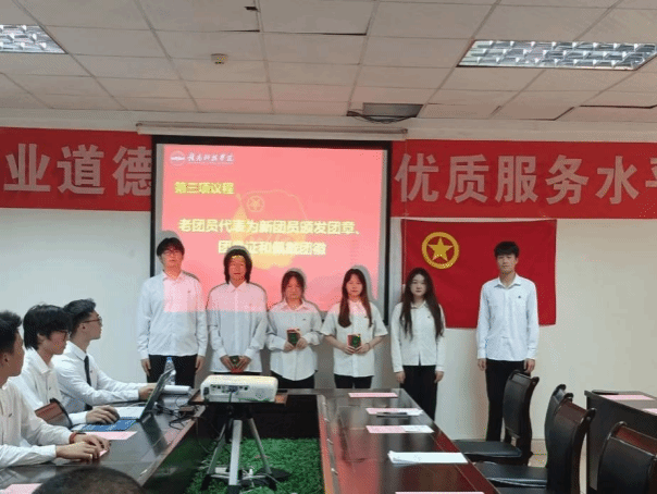 最后全体起立,奏唱团歌,以青春的名义迎接新时代,新老团员将以奋进的姿态建功新时代,让青春因担当而厚重,因拼搏而精彩。期待新团员能够时刻勉励自我、坚定理想信念、练就过硬本领、投身强国伟业,始终保持艰苦奋斗的前进姿态,在实现中华民族伟大复兴的中国梦的征程上不断向前、奋勇拼搏,在矢志奋斗中谱写新时代的青春之歌。
