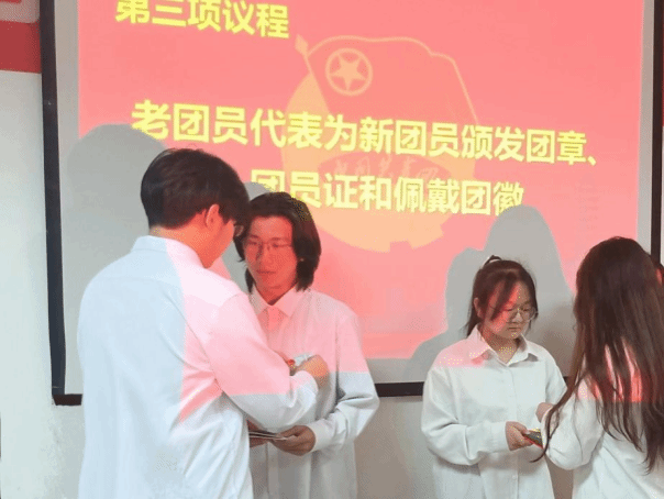 入团仪式开始,全体人员起立奏唱国歌,随后由张敏宣布新团员名单,老团员为新团员颁发团员证、佩戴团徽。在入团宣誓过后,由入团介绍人代表肖志华宣读团员义务和权利,而后由新团员代表夏佳坤、老团员代表姜维哲发言,最后由朱根松对入团仪式做总结,并对新团员做出了三点要求:第一,要自觉树立远大理想,立志成才;第二,要刻苦学习科学文化知识,学好专业知识;第三,要积极参加学校和社会组织的各项活动。
